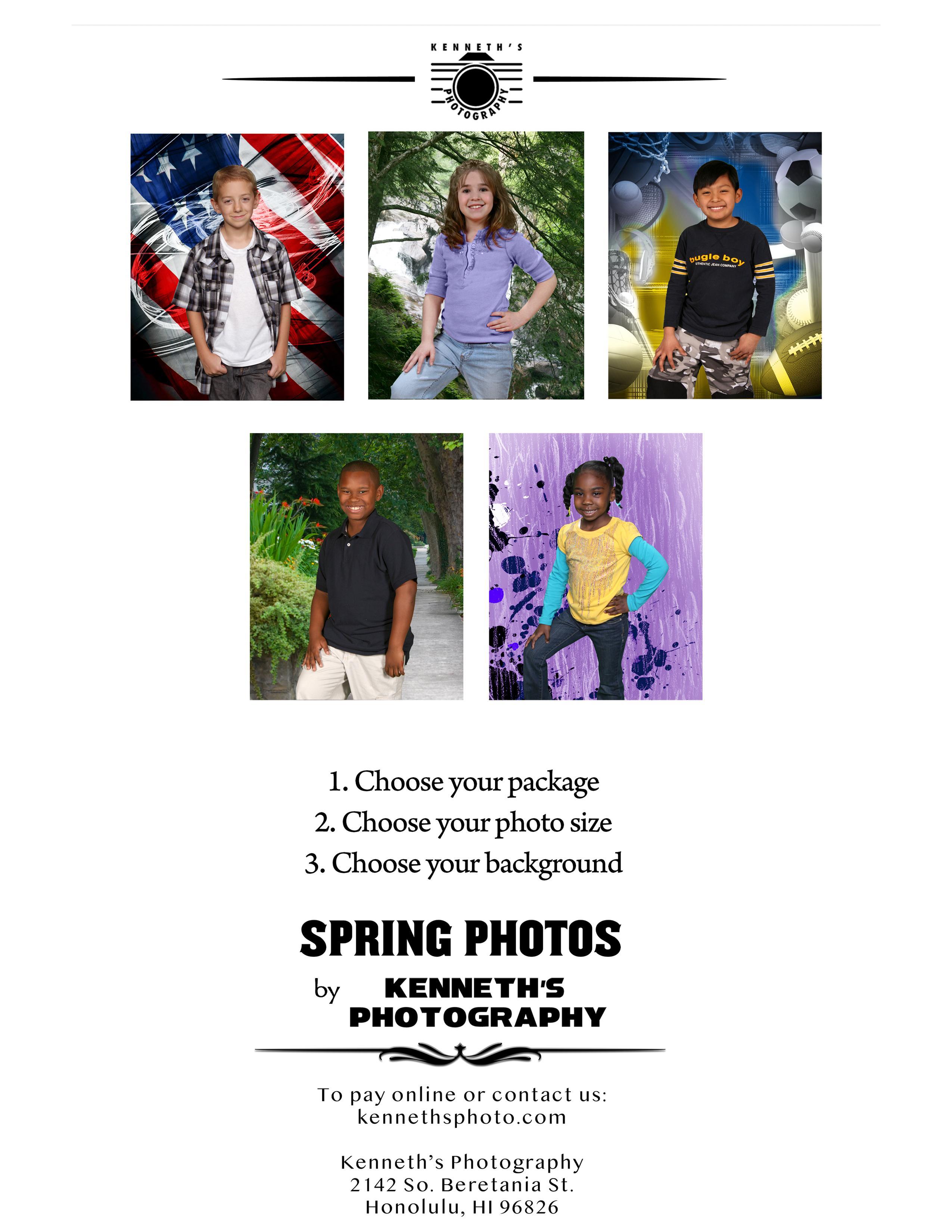 Spring Portraits will be taken this Wednesday, February 18th in our library. Picture packages may be purchased online at https://www.kennethsphoto.com/ with a credit card. Students may also turn in order forms and payment (cash only) at the time of the photo shoot. Participation is optional and not required.