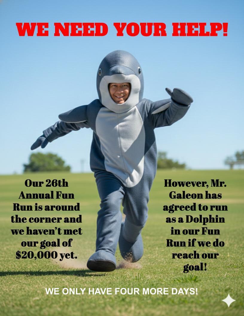 - Progress: We've already raised $3,000! That's a super start, but we still need your help to reach our big $20,000 goal! If we reach our goal, Principal Galeon will join us at the Fun Run dressed up as the MIGHTY DOLPHIN! Let's keep collecting to see Mr. Galeon in that amazing costume!